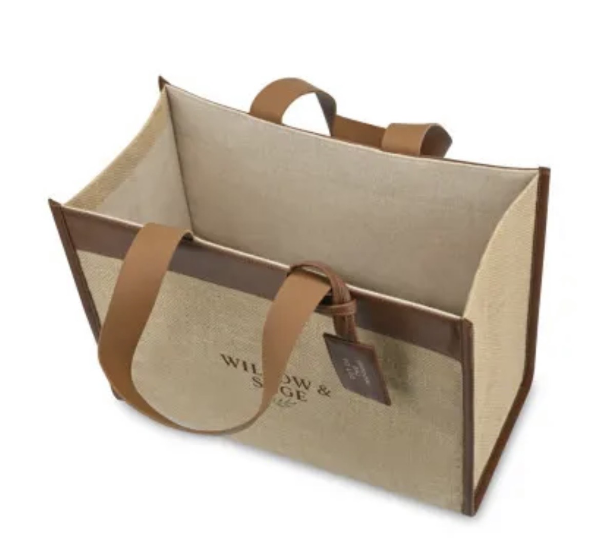 This jute fiber tote offers a spacious open top with a removable base insert. The design features durable dual handles for comfortable carrying. Made with vegan leather trim and a recycled cotton canvas lining, this silhouette balances modern style with everyday function. Lightweight yet structured, this tote transitions smoothly from daily routines to travel plans. The blend of thoughtful details and timeless styling makes it a dependable option for repeat use.